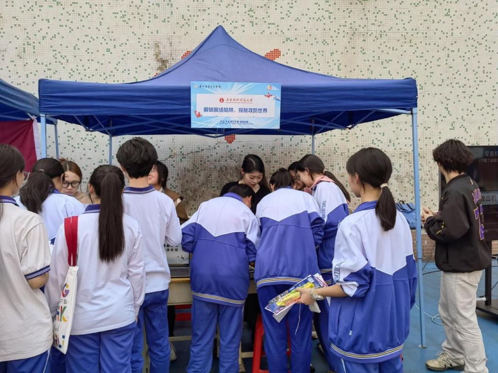 操场另一侧,科学展演摊位也同样十分火热。网安科普科创协会以“答题闯关”形式开展活动,参与者从抽题箱中随机选取题目进行答题,内容涵盖网络安全、电信诈骗等领域,并以生动案例普及防诈骗、数据保护等知识,引发中学生热烈讨论。活动现场,SAS攻防俱乐部循环播放网络攻防实战视频,并通过现场讲演,将生活现象与科学原理巧妙结合,吸引众多中学生驻足观看、咨询。参与活动的网安学院学生表示:“希望通过轻松的形式,让中学生感受科学魅力,激发探索欲。”
