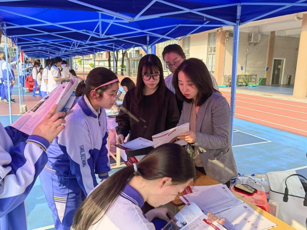 在高校招生咨询摊位,我校招生办老师与科学与技术教育专业研究生通过发放精心设计的招生手册、特色文创周边礼包,向十六中学生立体化呈现我校办学实力。手册内容涵盖学校概况、办学条件、学科优势、特色专业、产学研融合等内容,而帆布袋、书签、校园风景明信片等文创周边则凭借青春活力的设计风格,成为中学生争相收藏的单品。现场咨询气氛热烈,不少学生围绕专业选择、升学政策、校园环境等提出问题,师生团队逐一耐心解答,并鼓励学子们明确目标、积极备考。许多学生表示对大学的学习方向有了更清晰的规划。
