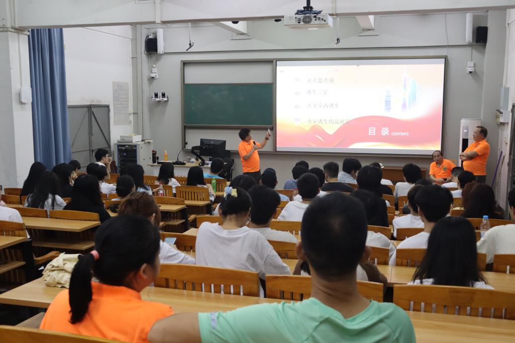 活动分为两个环节。首先是现场实践环节,张志明和李智现场用通俗易懂的语言和身临其境的演示为同学们介绍了常见的急救器材和消防器材,重点讲解了如何使用AED急救装置,并为大家传授了科学有效的火海逃生方法和技巧,包括快速判断逃生路线、正确使用灭火器材、临时实施急救包扎等关键技能,使同学们对消防安全有了更为直观和深入的了解。之后是科普学习环节,讲解员结合之前的实践情况对消防和急救相关的知识进行科普,并号召大家将消防安全知识内化于心、外化于行,做到防患于未然。