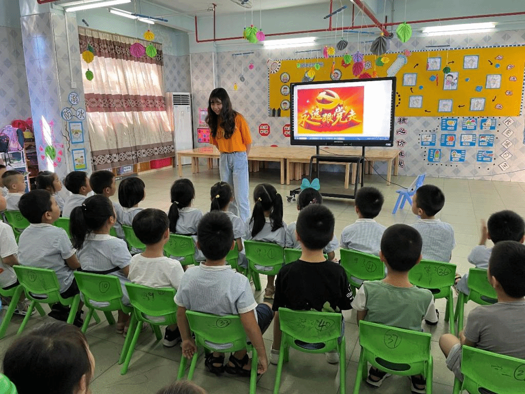 2021年7月23日下午,网安学院党史宣讲团成员20网安师1班刘橙语来到的广东省阳江市闸坡中心幼儿园,给大大二班的小朋友上了一节以“永远跟党走”为主题的党课。课堂伊始,小朋友们便热情饱满地跟着刘橙语读了六次“永远跟党走”,课上小朋友们踊跃发言,描述了自己心中的党的样子,其中几位小朋友主动分享自己知道的党史小故事,如王二小的故事、小英雄王璞、儿童团团长海娃、小侦查员张嘎等。课程最后,宣讲员刘橙语和小朋友挥舞着国旗一起唱起了《我和我的祖国》。